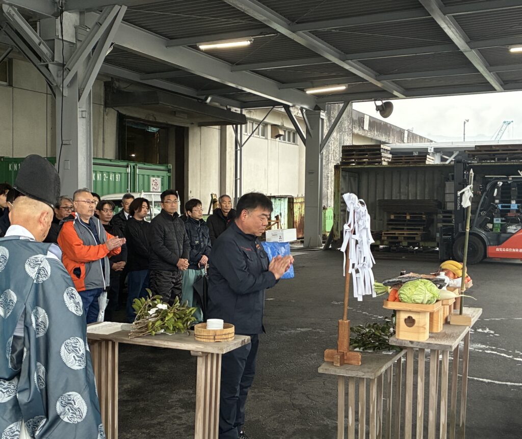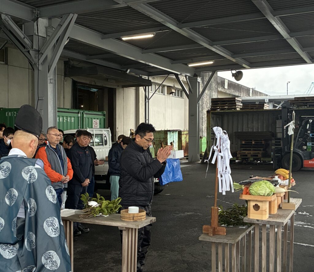 令和8年1月5日(月)、今年一年の航海安全と無事故運航を祈念し、新春安全祈願祭を執り行いました。海運業は常に自然の脅威と向き合う仕事であり、安全祈願は私たちにとって一年の始まりを告げる最も重要な行事です。祈願祭では、各船舶の安全と乗組員をはじめ全社員の無事を祈願いたしました。年頭式では、杉木社長より一人ひとりの安全意識を高め、変化を恐れず新しいことに挑戦してほしいという新年の訓示がありました。南和海事は、本年も「安全第一」を基本理念とし、地域社会に貢献できる海運会社として、確実な輸送サービスの提供に努めてまいります。