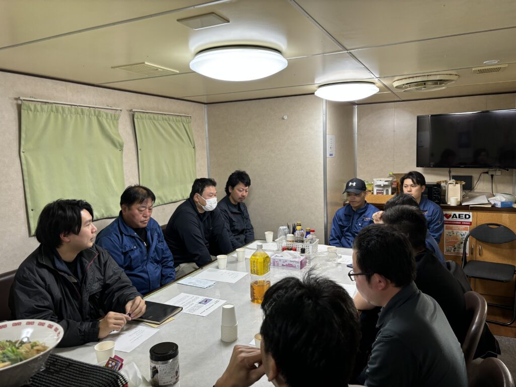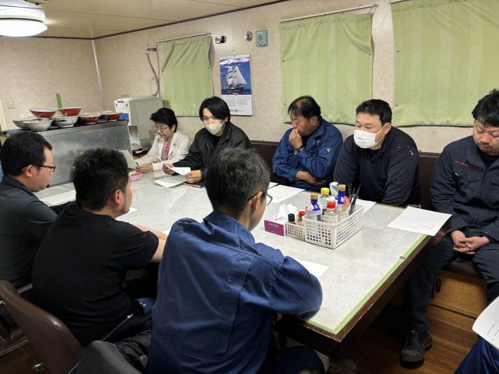 通常、博多港〜那覇港間を運航している貨物船「りゅうなん」が、2月23日から25日にかけて鹿児島港に停泊しました。停泊期間を活用し、船内食堂にて乗組員と陸上員による安全会議を24日に開催しました。会議では、昨今、報道された船舶事故の事例を基にした意見交換、ヒヤリハット報告の共有および乗組員の体調管理等について活発な議論が行われました。当社は引き続き、乗組員一人ひとりの安全意識を高め、安心・安全な運航に努めてまいります。なお、「りゅうなん」は翌25日、次港の博多港に向けて出港しました。